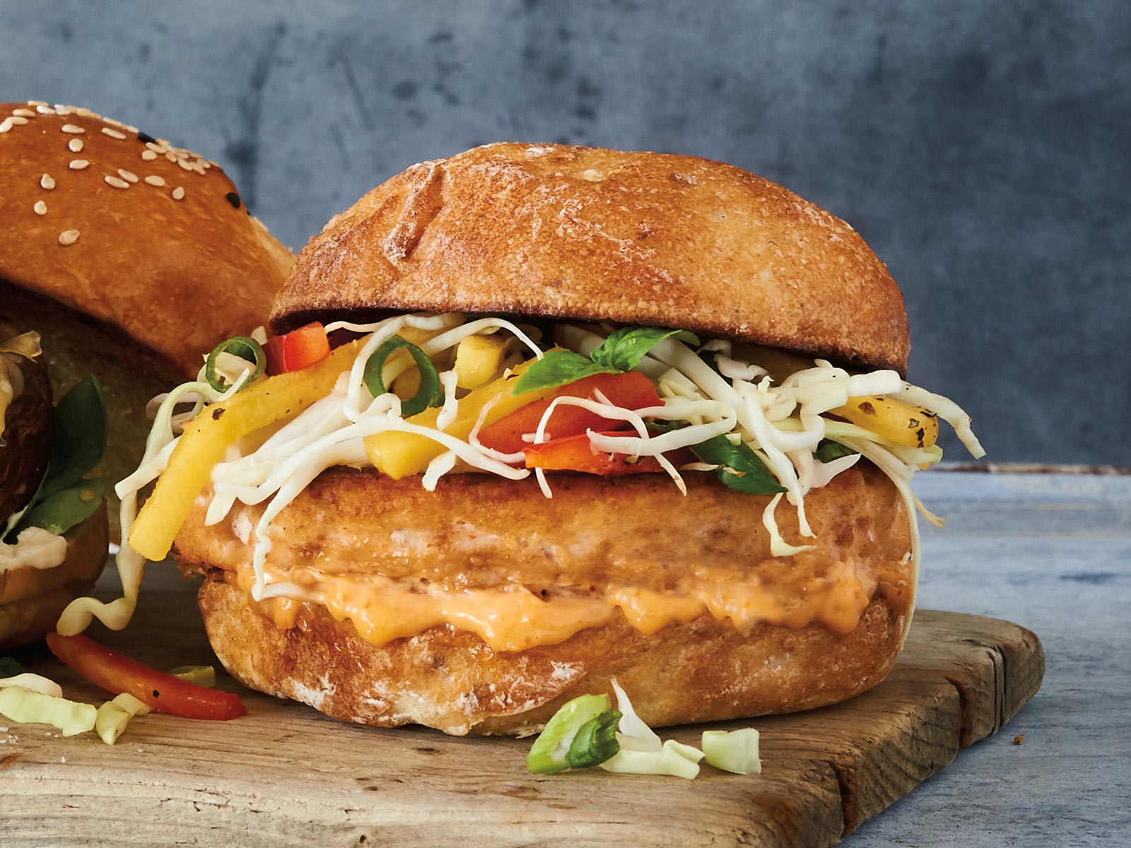 Spread mayonnaise on cut sides of buns and top lettuce, Pollock burgers, 1/4 cup salad and sprinkle with basil and peanuts.